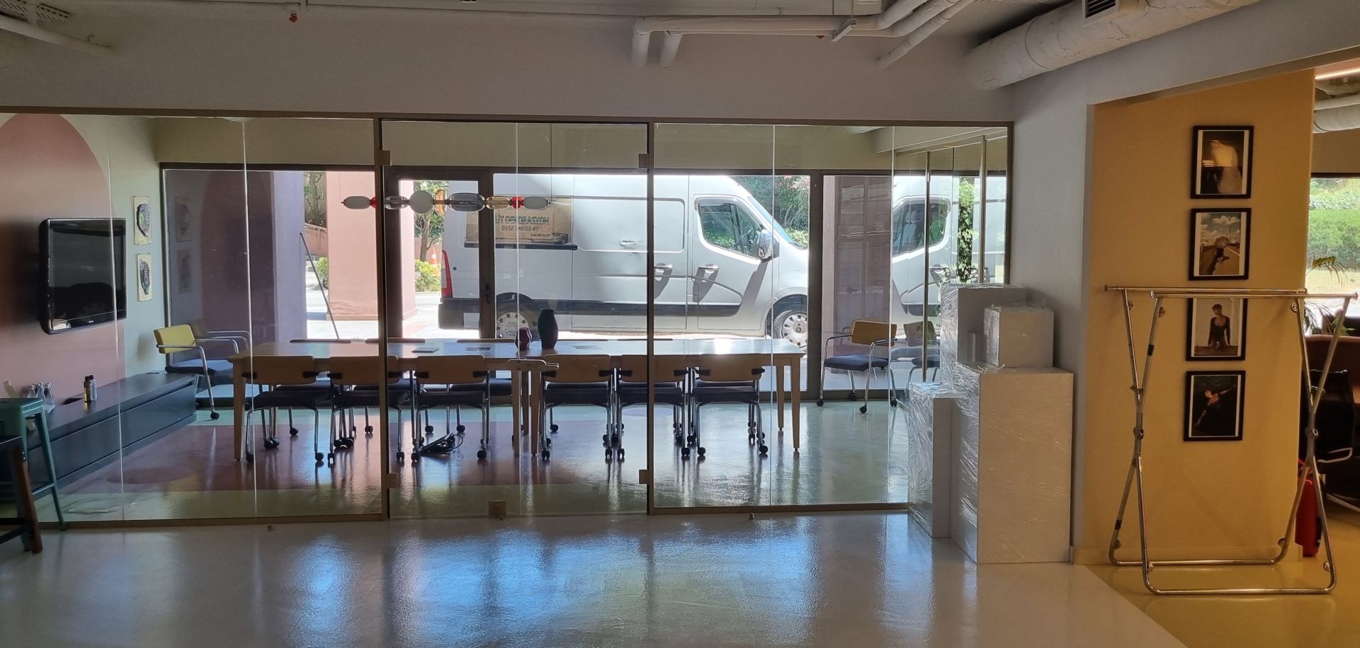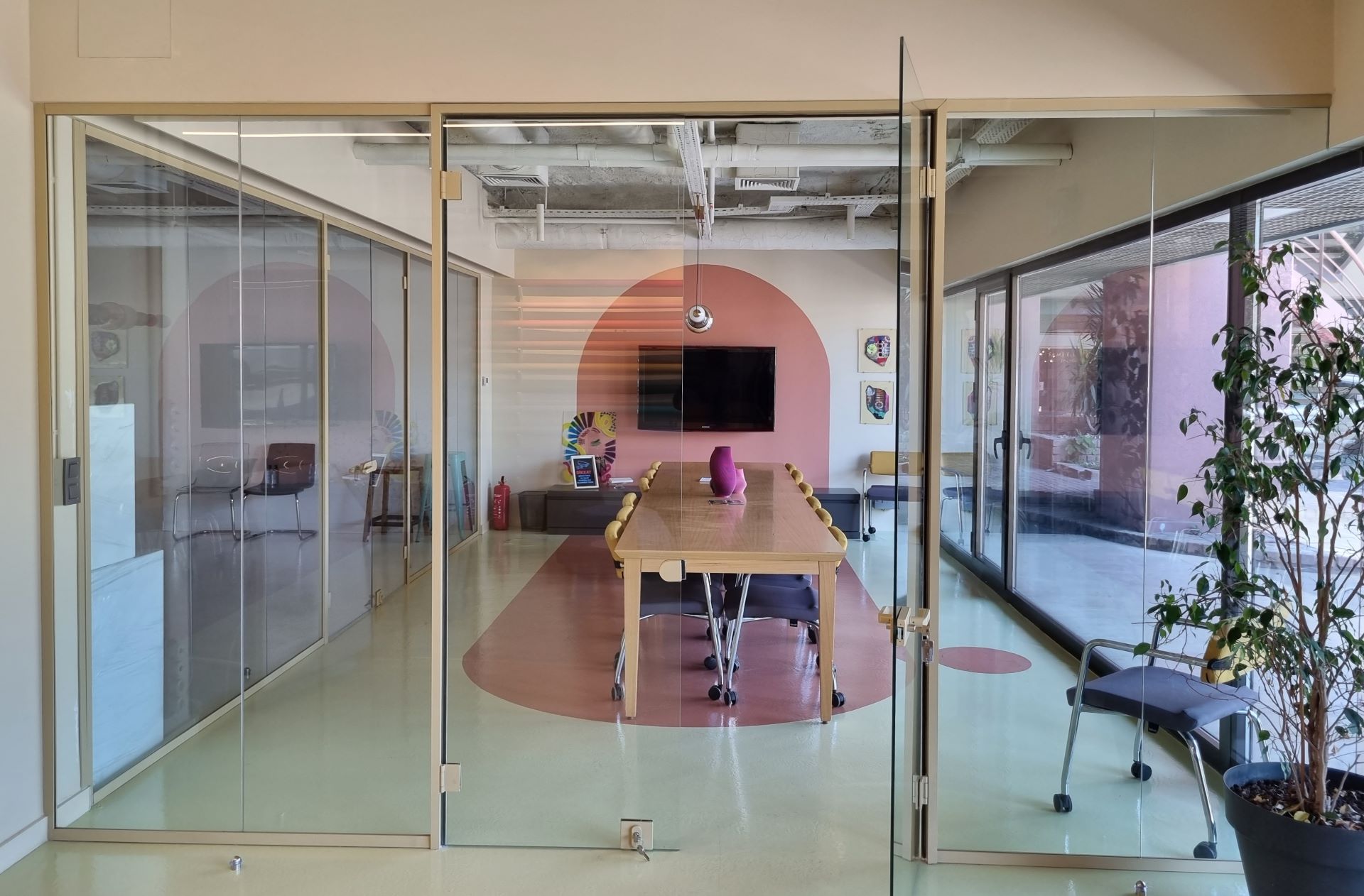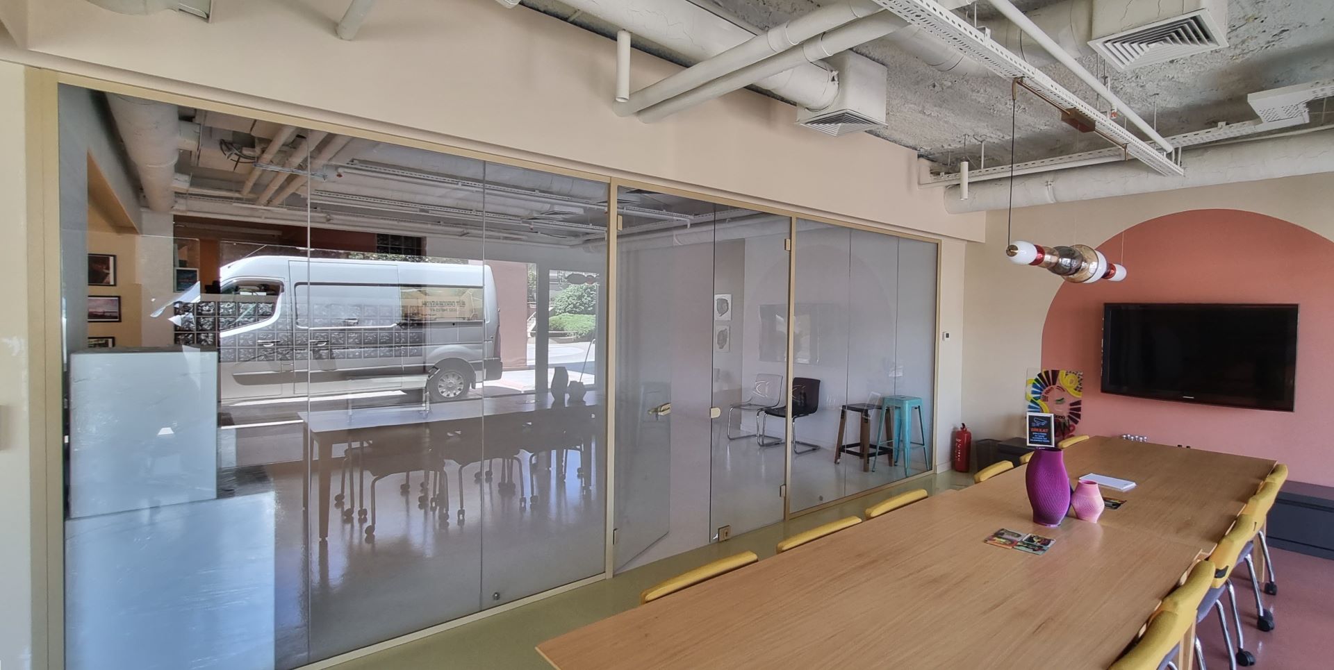 * DBS Saydam - Düşey profilsiz cam cama bölme duvar sistemi.