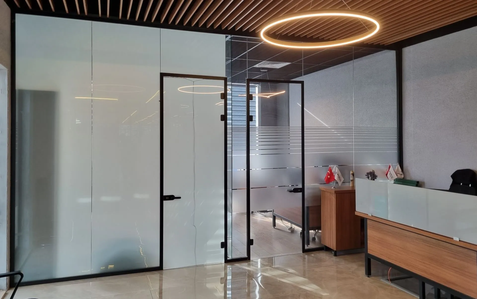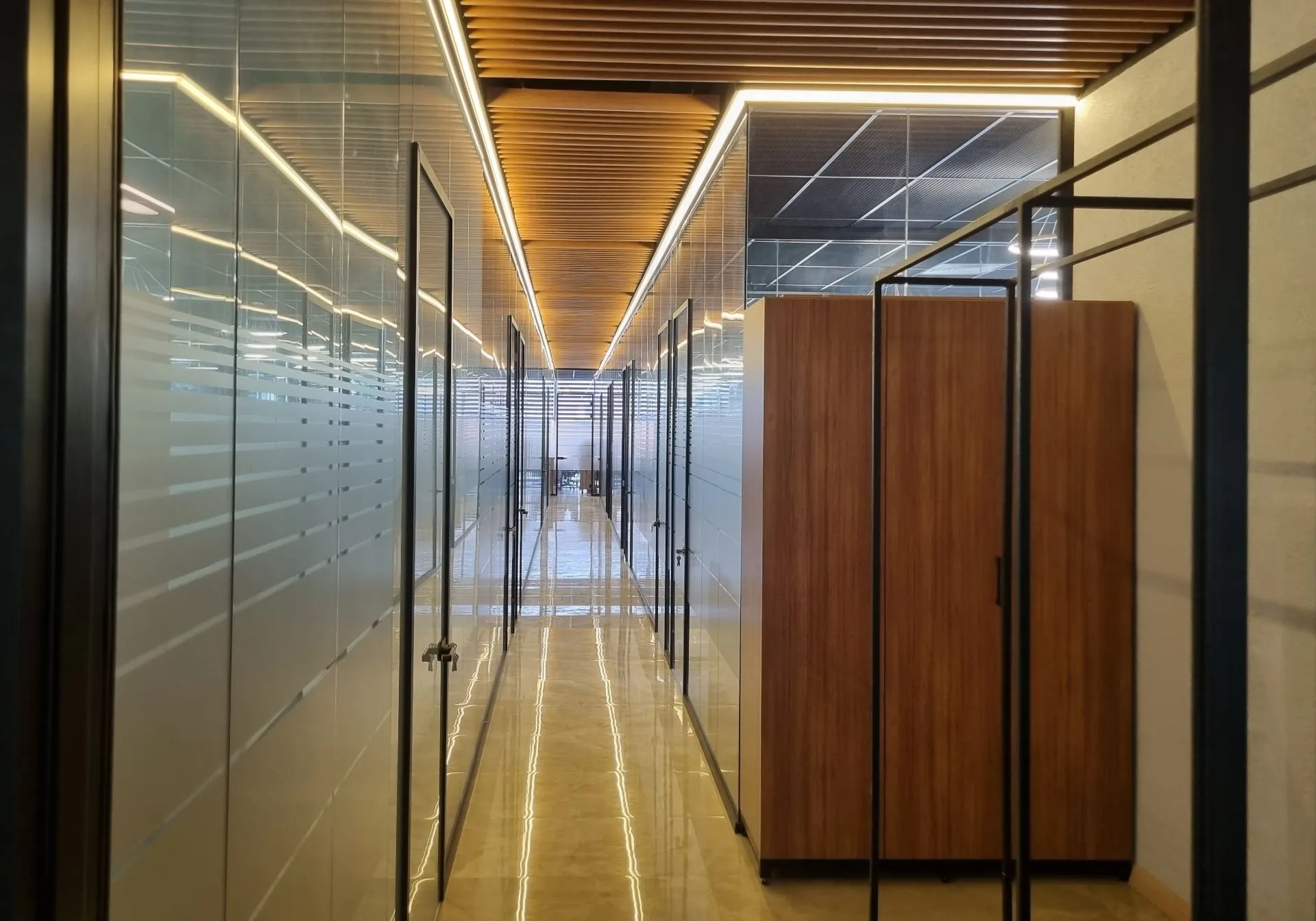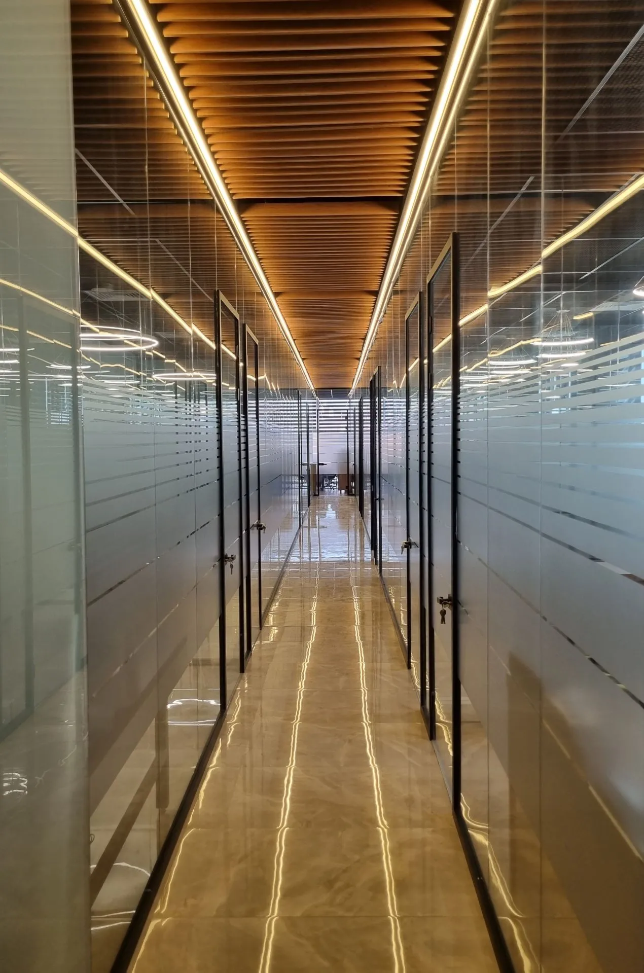Tuzla-Orhanlı da bulunan Seyhan Cam Genel Müdürlük Binasının cam cama bölme duvar sistemleri firmamız tarafından yapılmıştır. İhtiyaca göre bazı mekanların duvarlarında opak lamine, bazı mekanlarda şeffaf cam kullanılmıştır. Duvar yükseklikleri 300 cm olduğu için kapıların yüksekliği 250 cm de bırakılmış üst kısımlarında sabit cam kullanılmıştır. Giriş ve koridorun tavanında ahşap baffle tercih edilmiştir.