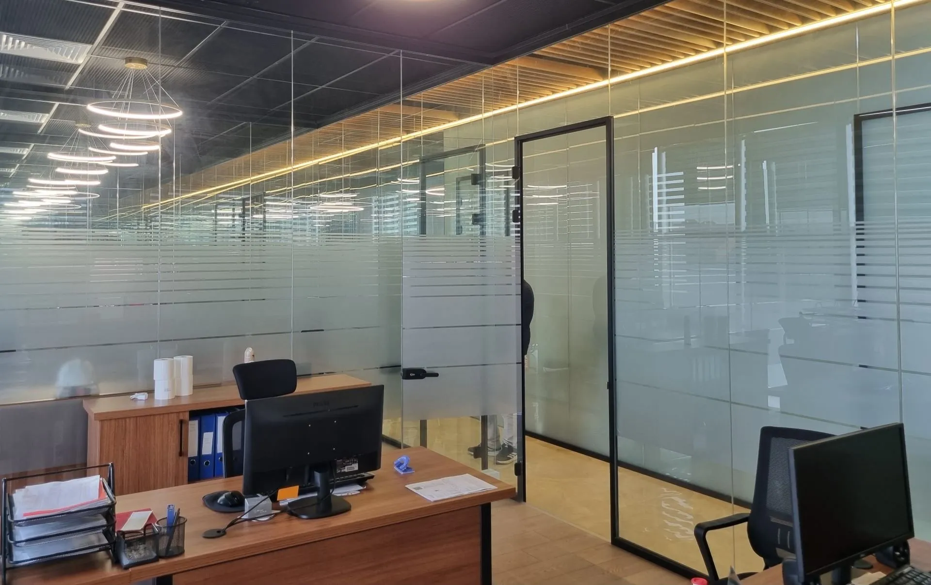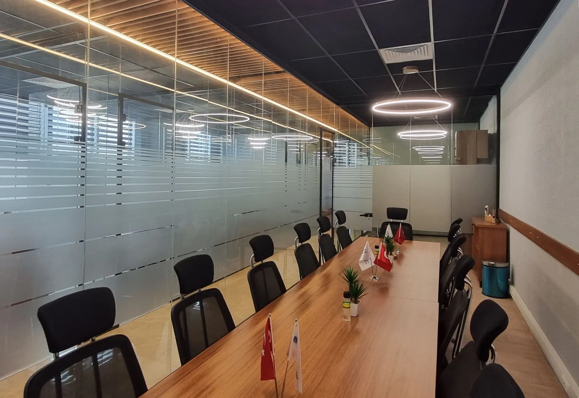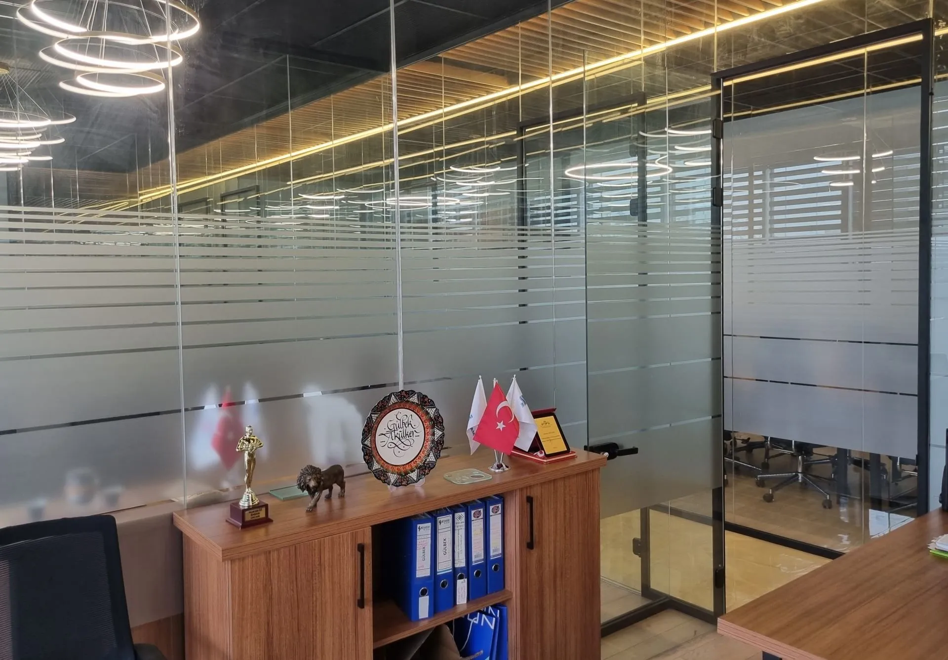 Tuzla-Orhanlı da bulunan Seyhan Cam Genel Müdürlük Binasının cam cama bölme duvar sistemleri firmamız tarafından yapılmıştır. İhtiyaca göre bazı mekanların duvarlarında opak lamine, bazı mekanlarda şeffaf cam kullanılmıştır. Duvar yükseklikleri 300 cm olduğu için kapıların yüksekliği 250 cm de bırakılmış üst kısımlarında sabit cam kullanılmıştır. Giriş ve koridorun tavanında ahşap baffle tercih edilmiştir.