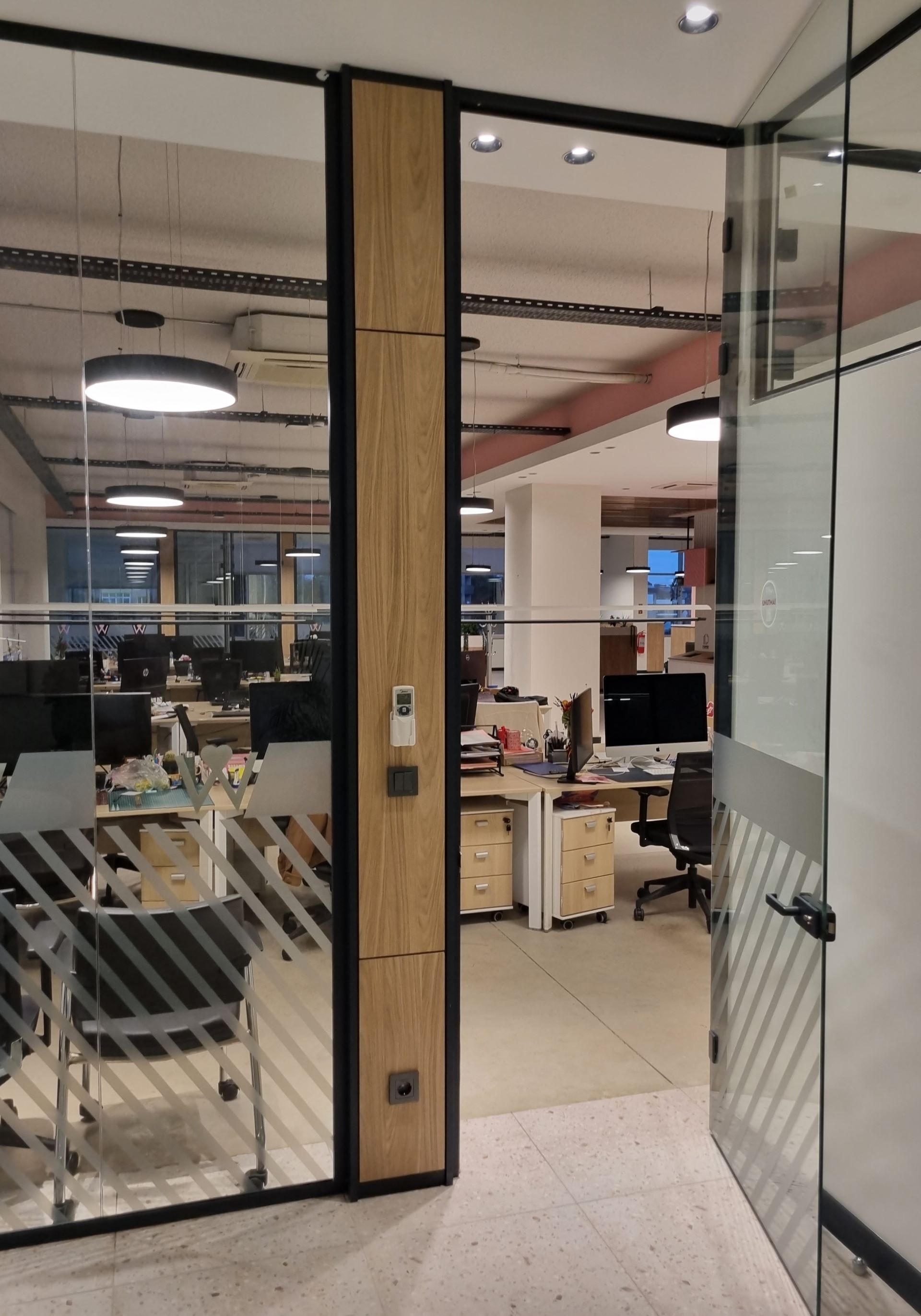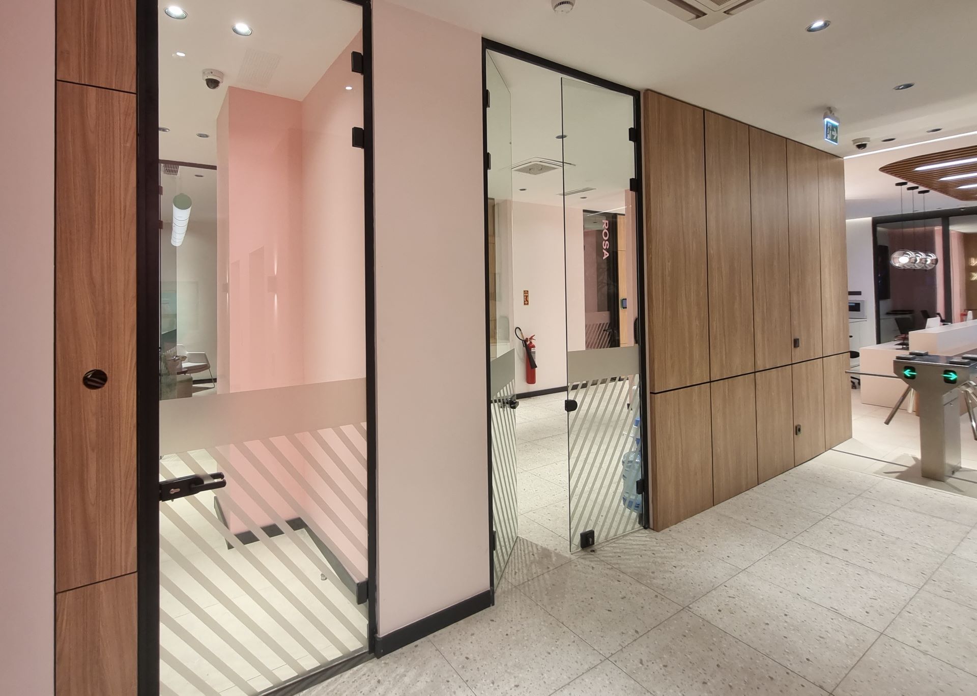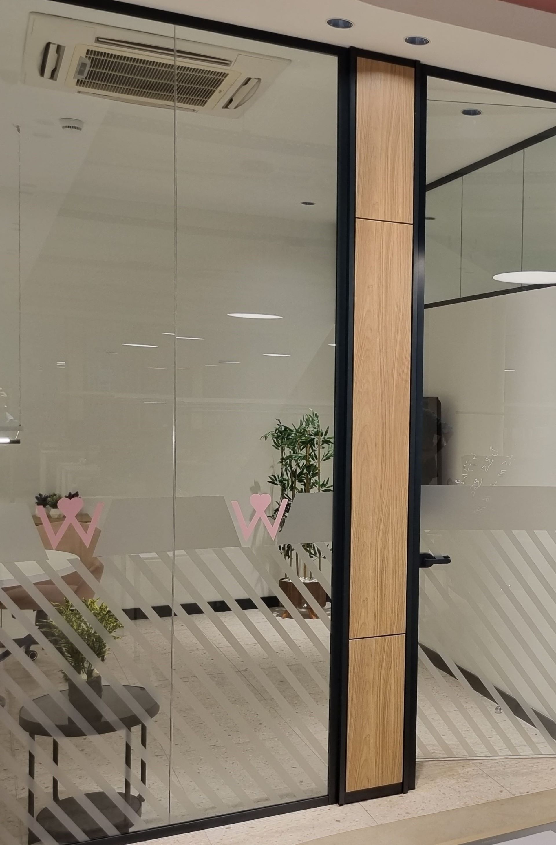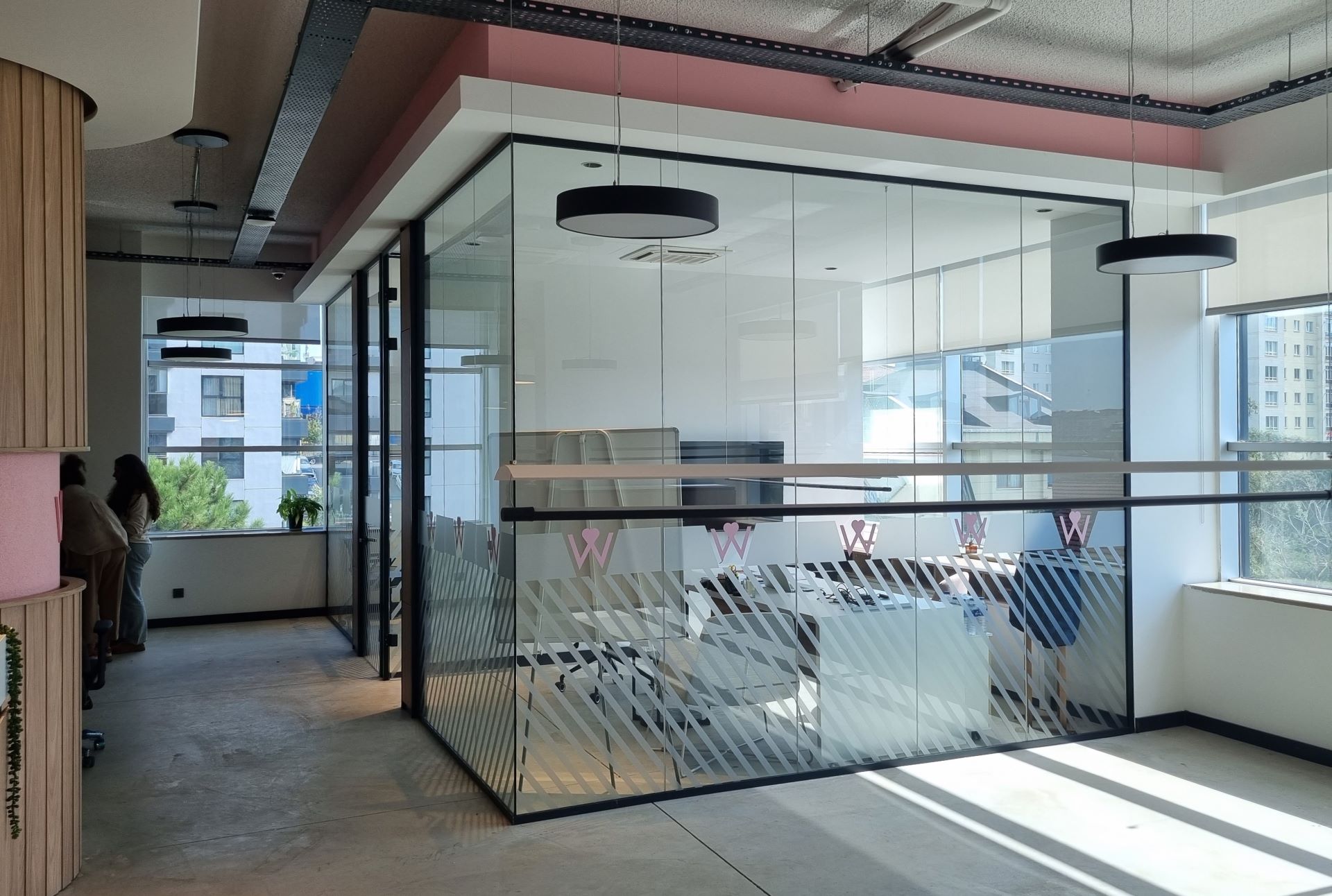 * DBS Saydam - Düşey profilsiz cam cama bölme duvar sistemi.