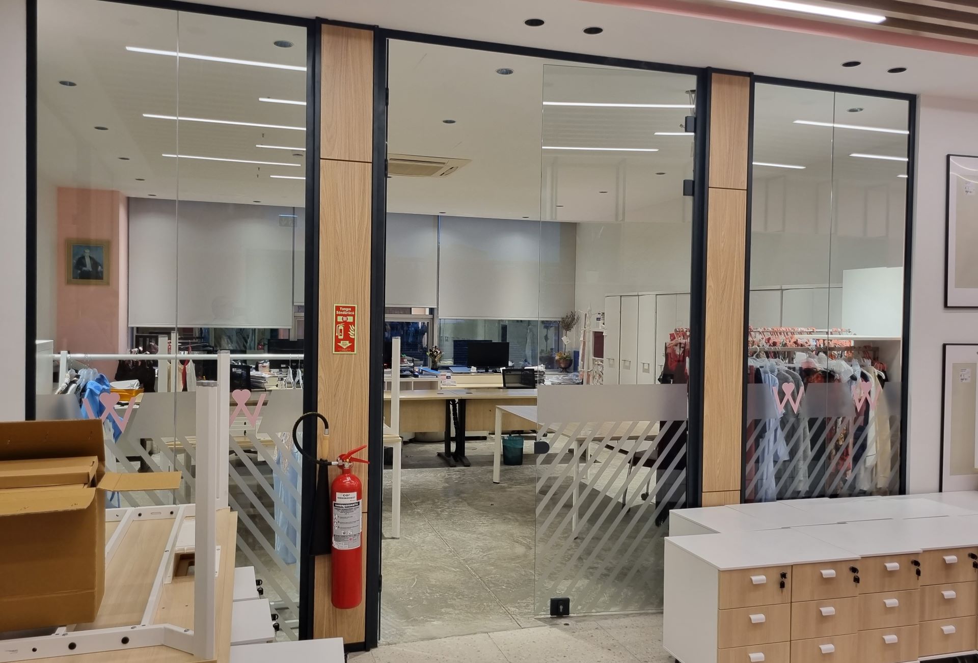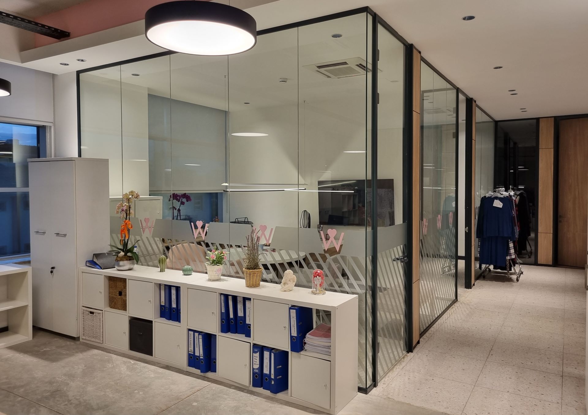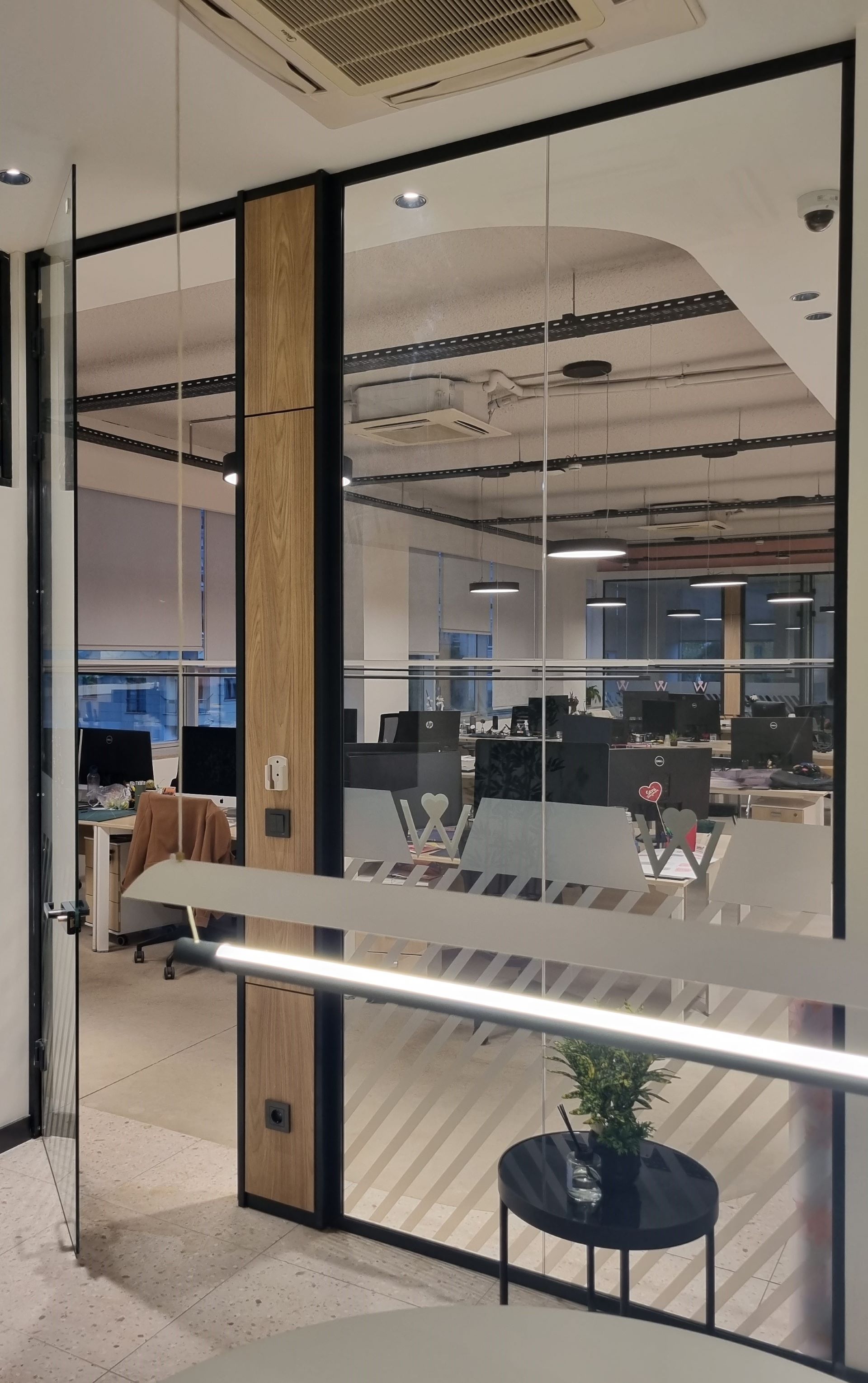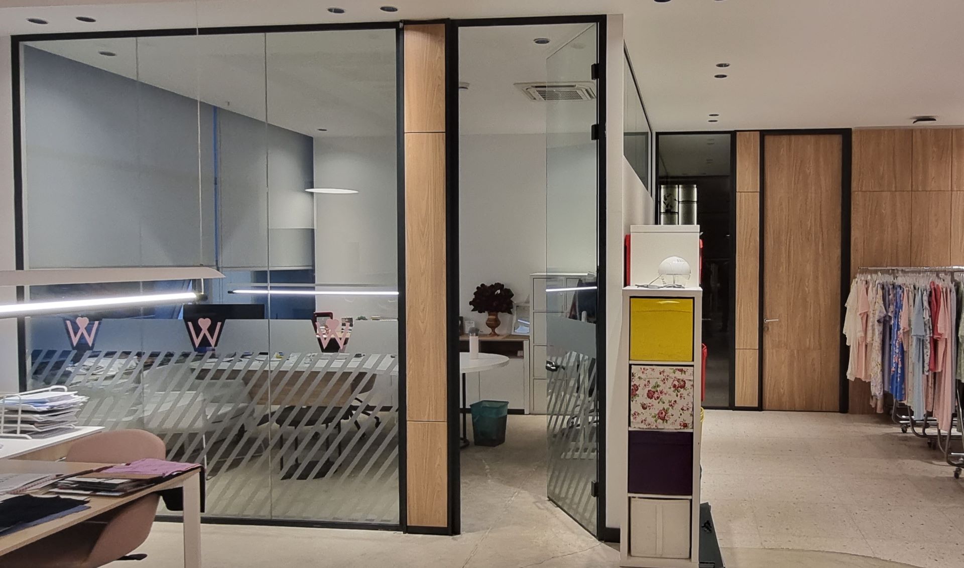 * DBS Saydam - Düşey profilsiz cam cama bölme duvar sistemi.