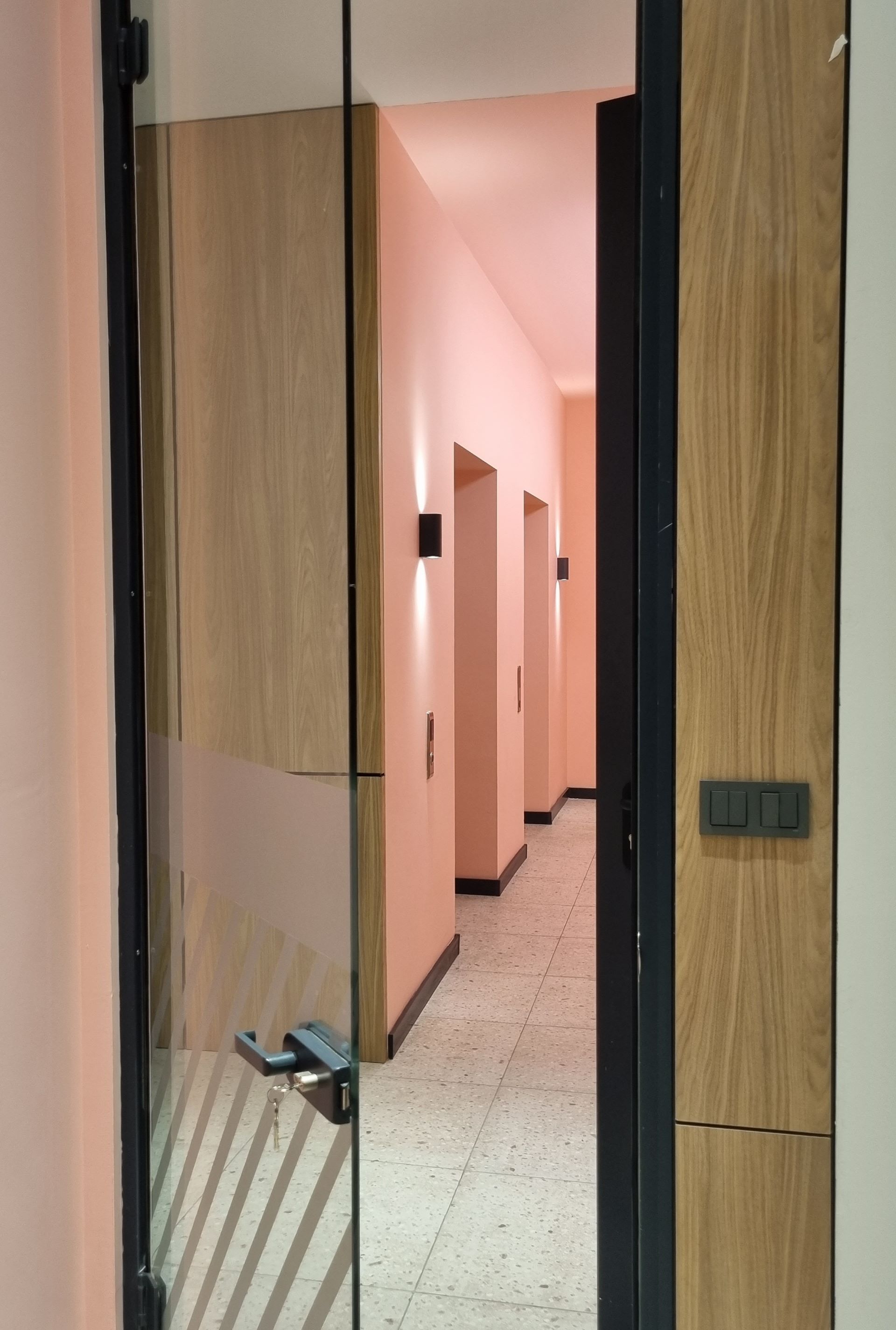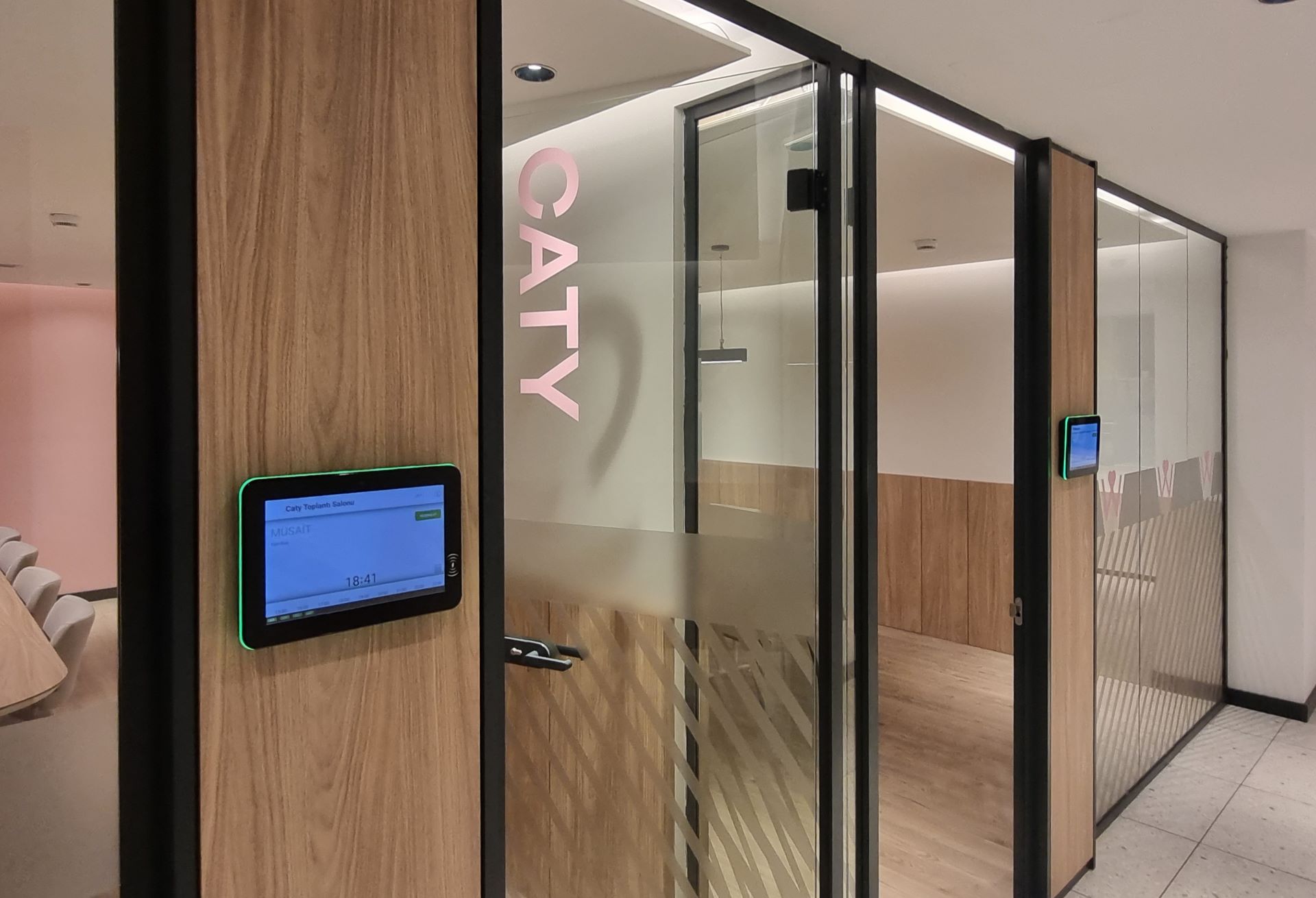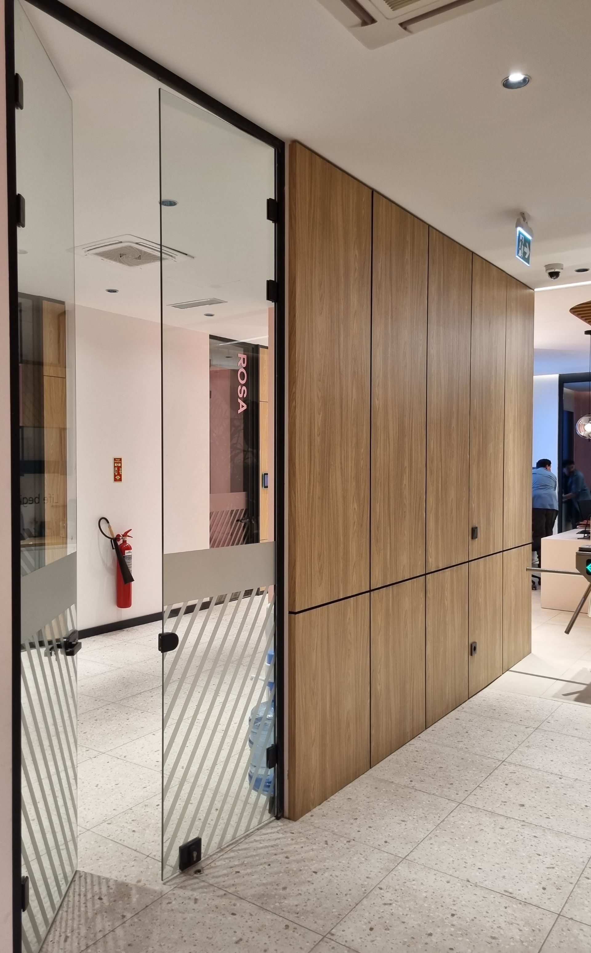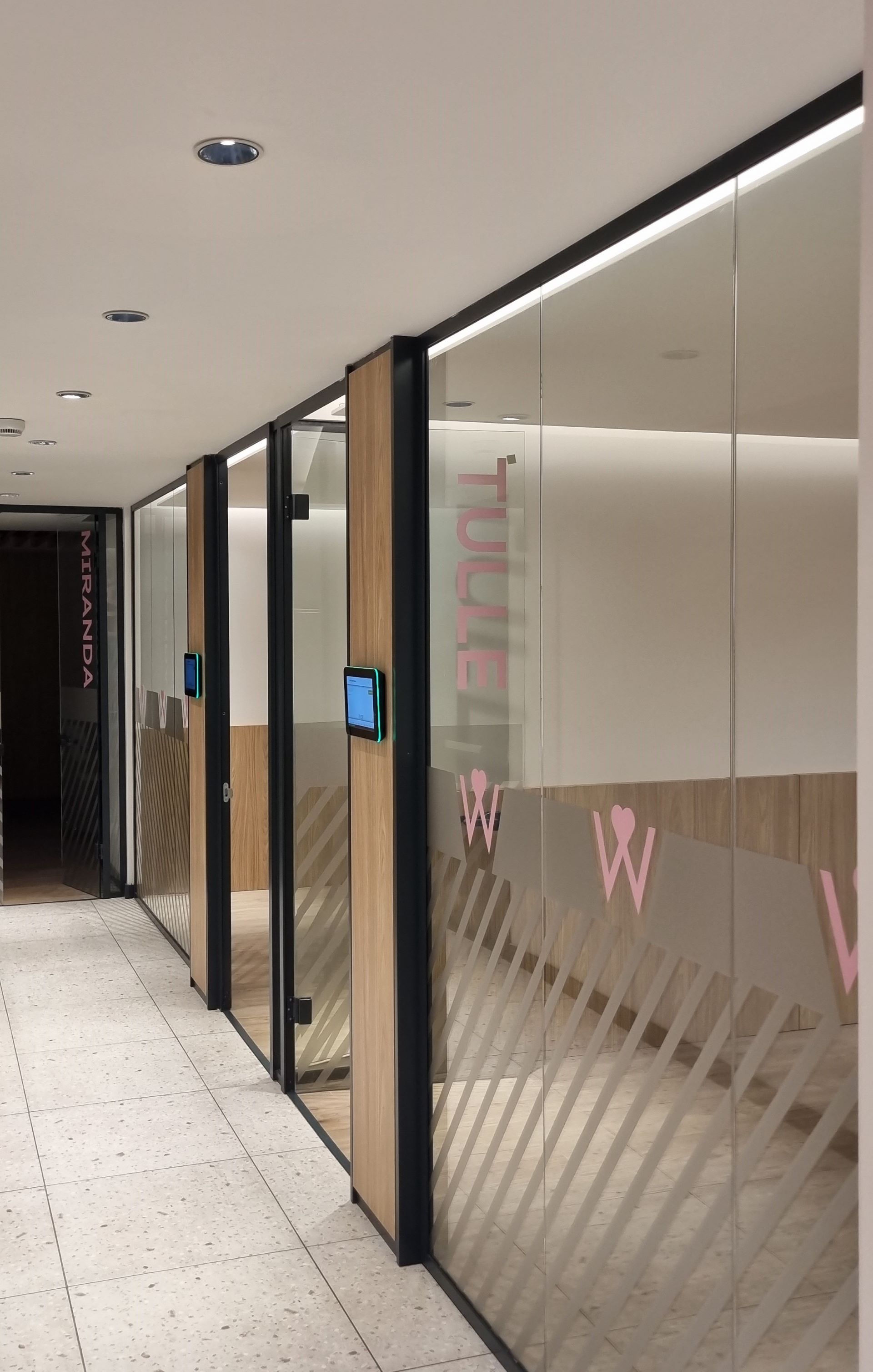 Cam bölmelerde kapı kenarlarında kullanılan ahşap kablo kanalları aydınlatma anahtarlarının ve bilgilendirme ekranlarının konulması için bir alan oluşturmuştur. Bu uygulama aynı zamanda mekanlarda sıcak ve şık bir görünüm oluşmasına imkan vermiştir.