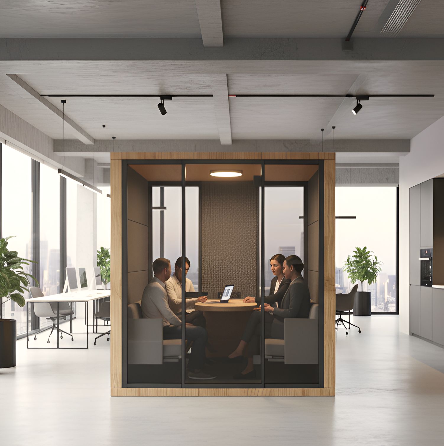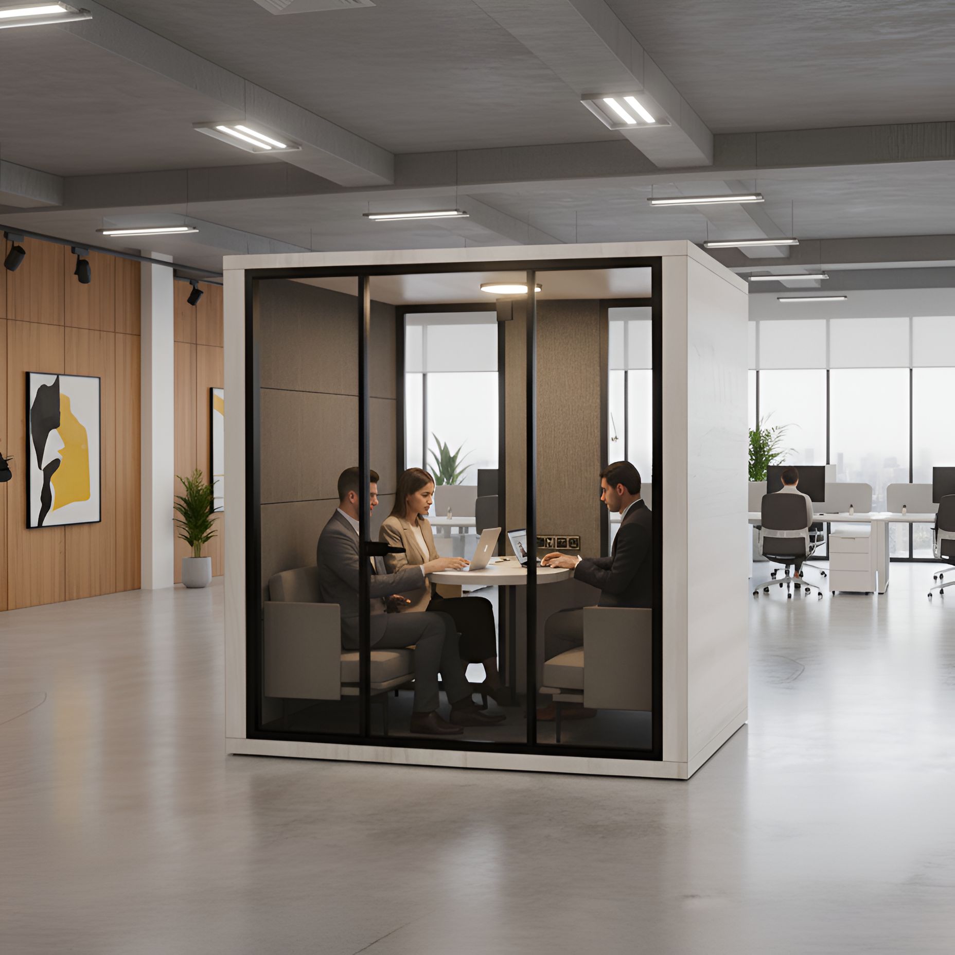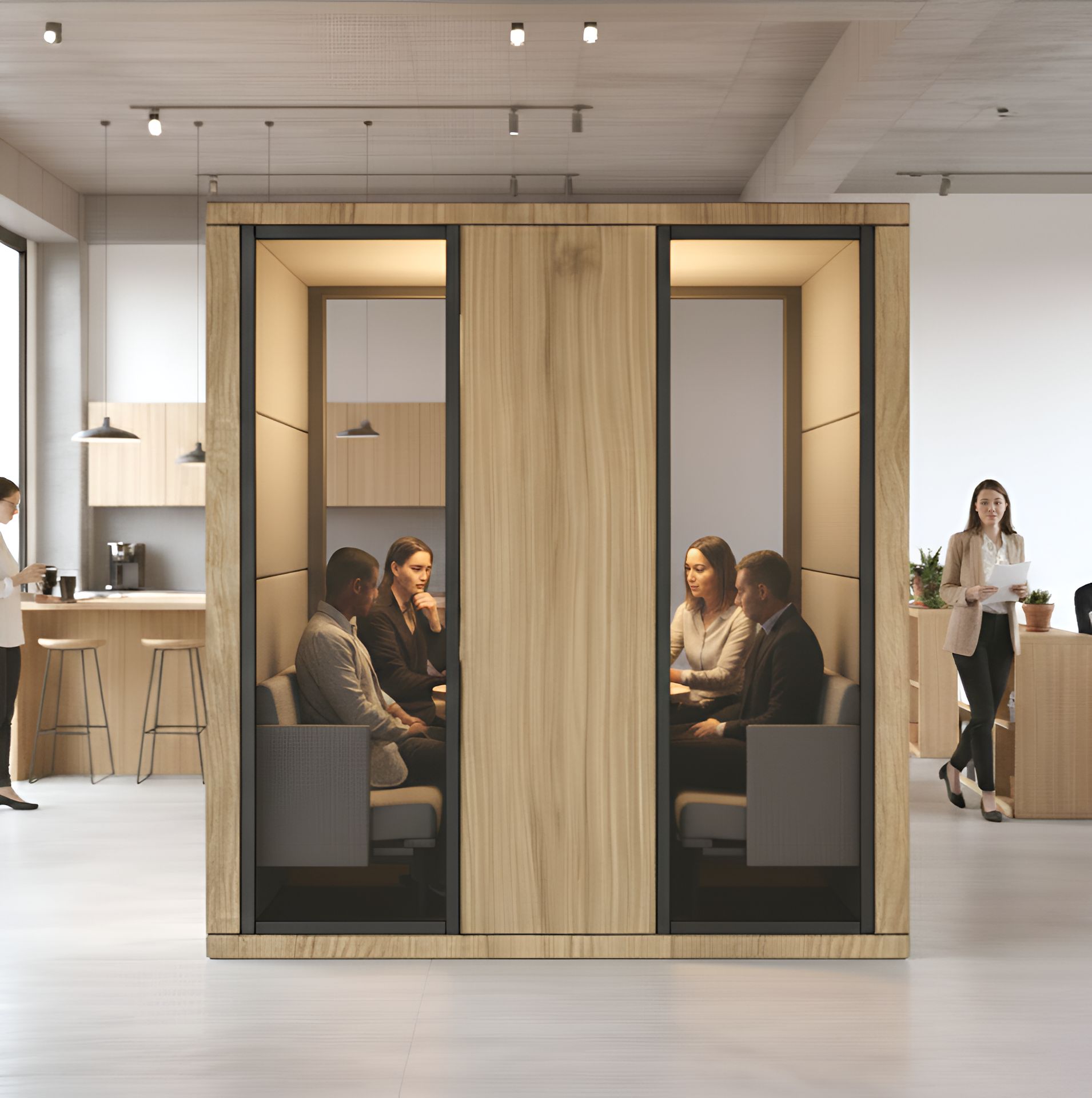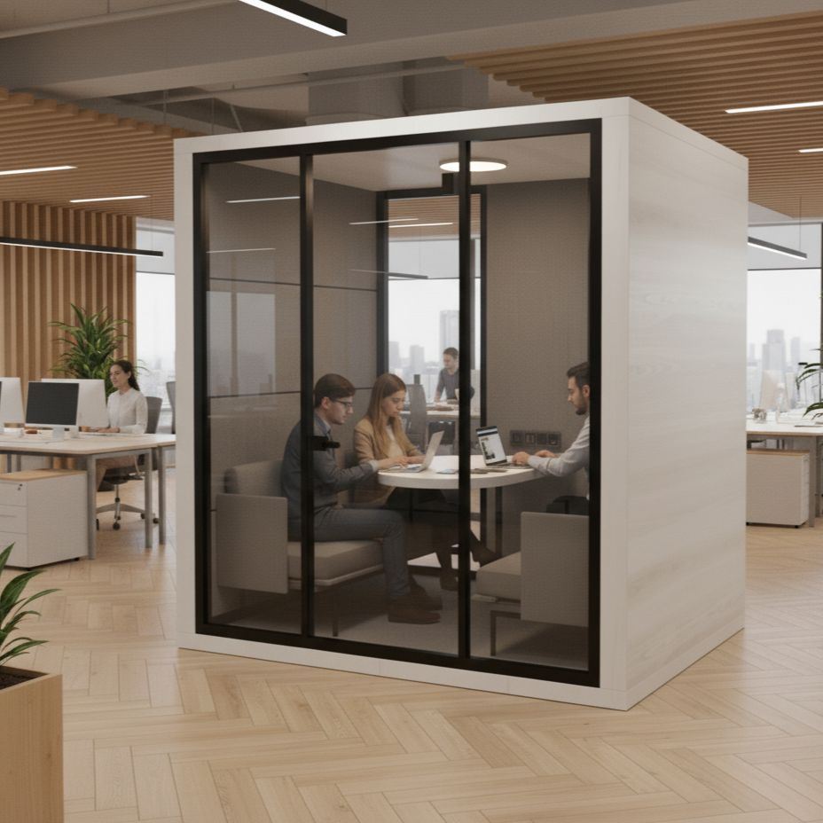 Designed for open offices and noisy environments, the Double Acoustic Meeting Booth provides a quiet and comfortable space, ideal for individual work or small meetings with two, three, or even four people — all away from external noise and distractions.