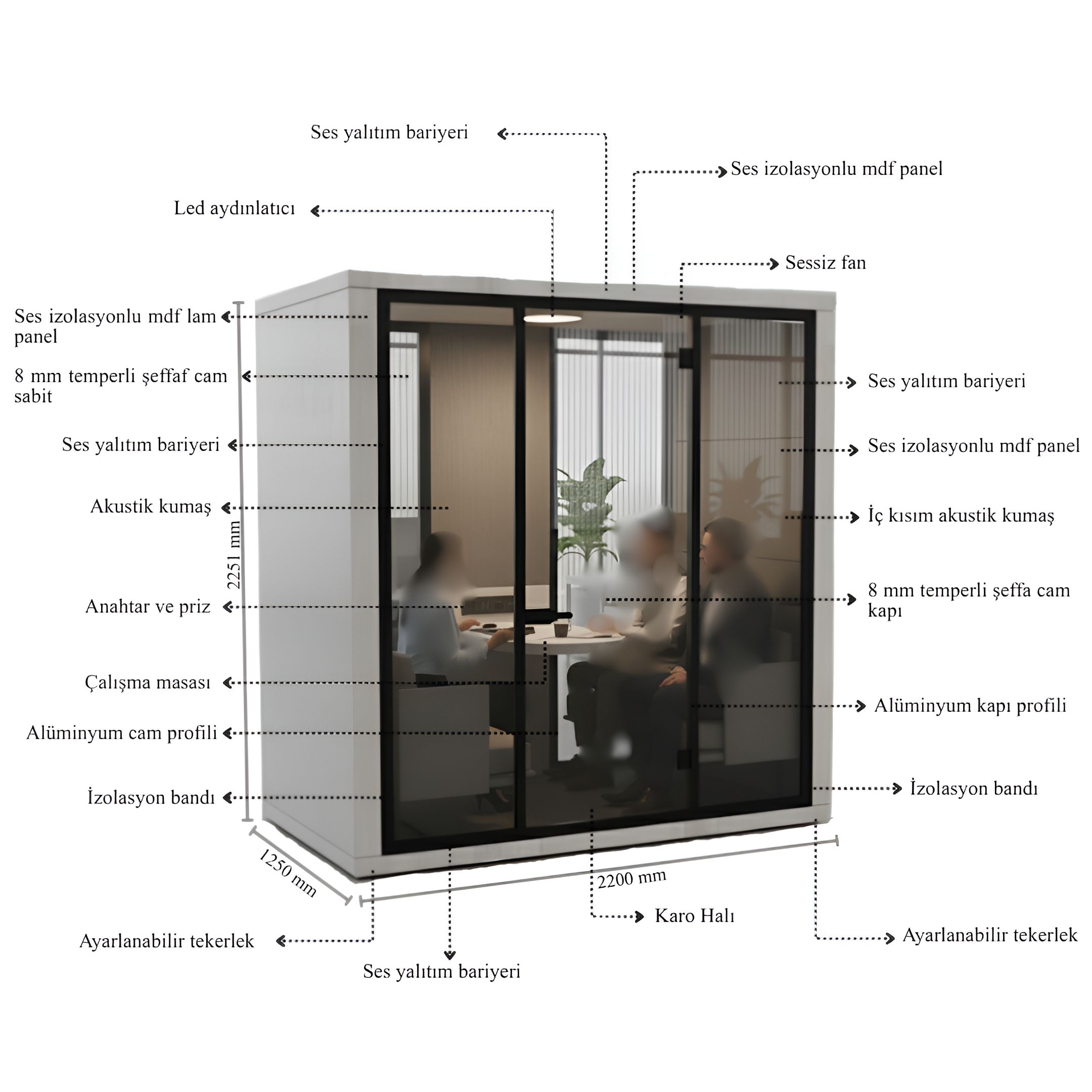 Açık ofislerde ve gürültülü ortamlarda ortamın gürültüsünden uzak, gerek tek kişinin çalışabileceği gerekirse iki,üç veya dört kişinin mini toplantı yapabileceği,görüşebileceği konforlu ve sessiz bir görüşme ortamı sunmaktadır.