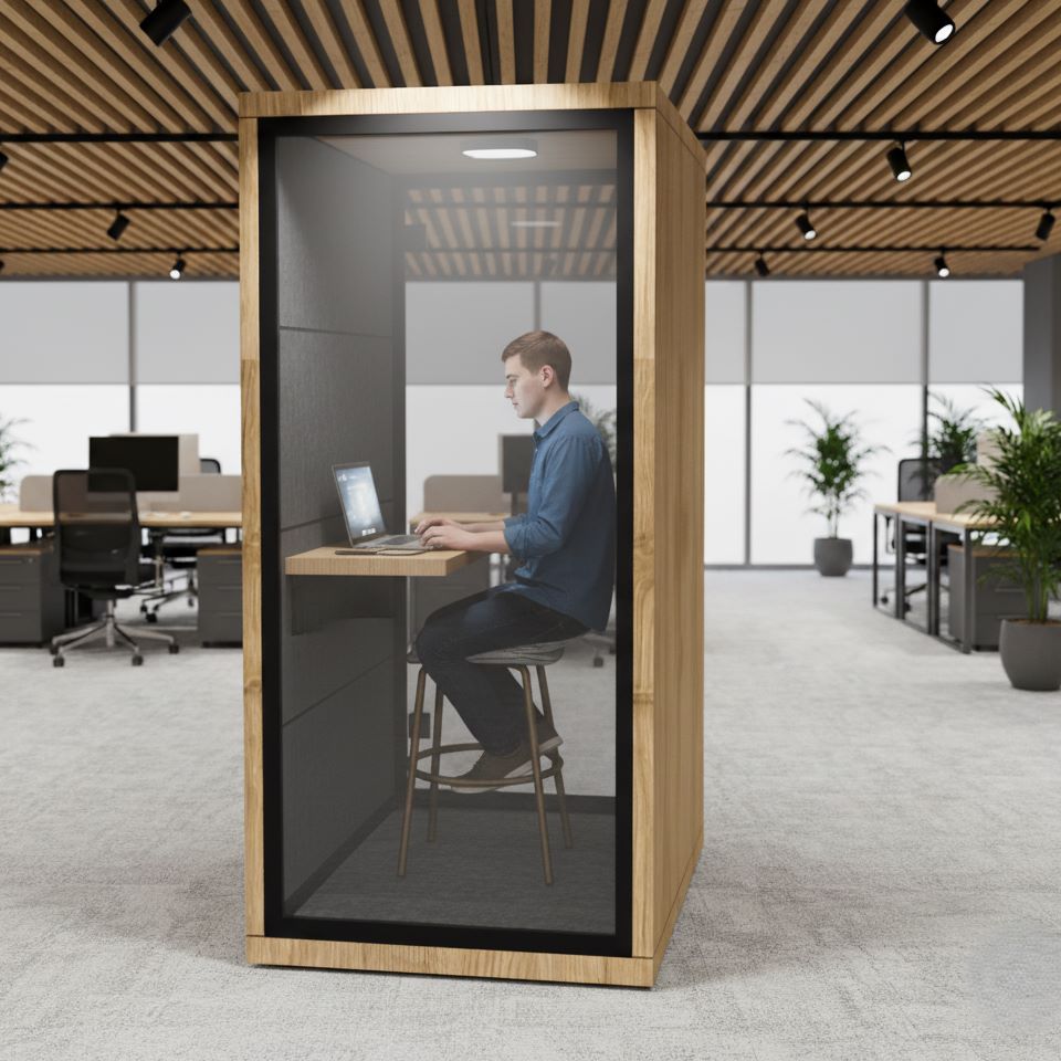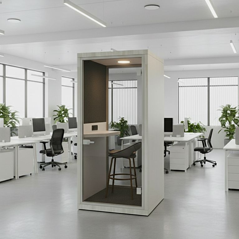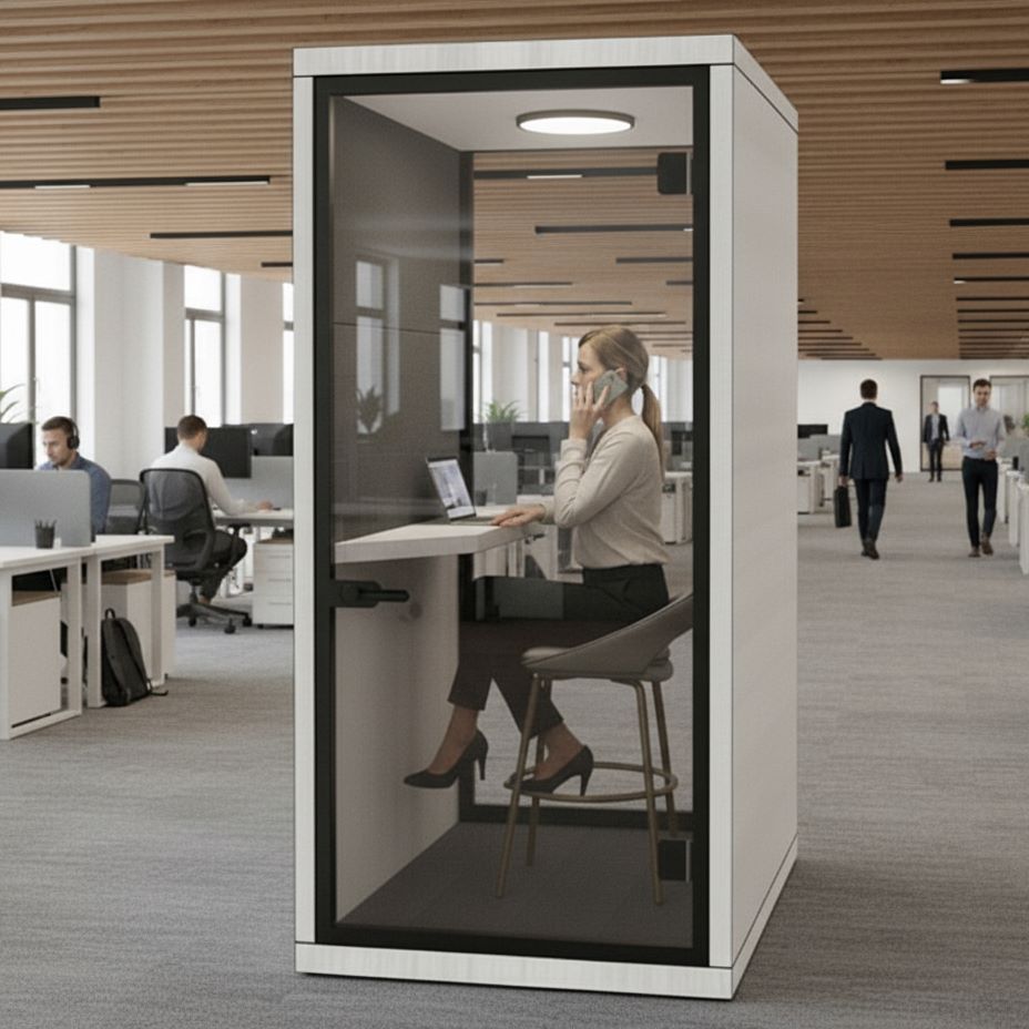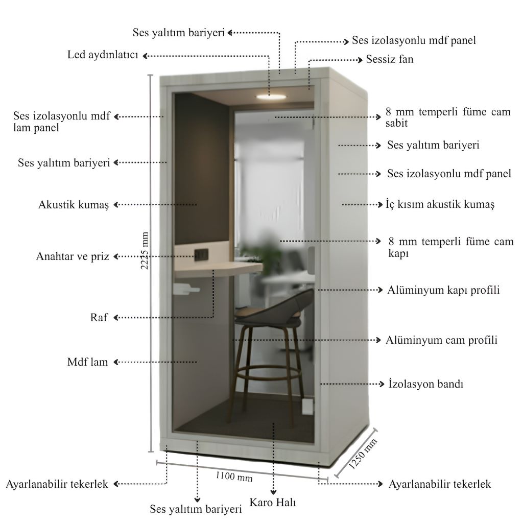 Açık ofislerde,gürültülü ortamlarda ortamın gürültüsünün telefon görüşmesi yapan kişiyi rahatsız etmemesi için,konuşan kişinin sessiz bir ortamda görüşme yapabilmesi için tasarlanmış olduğumuz Akustik telefon kabinleri görüşme yapan kişiye konforlu ve sessiz bir ortam oluşturmaktadır.