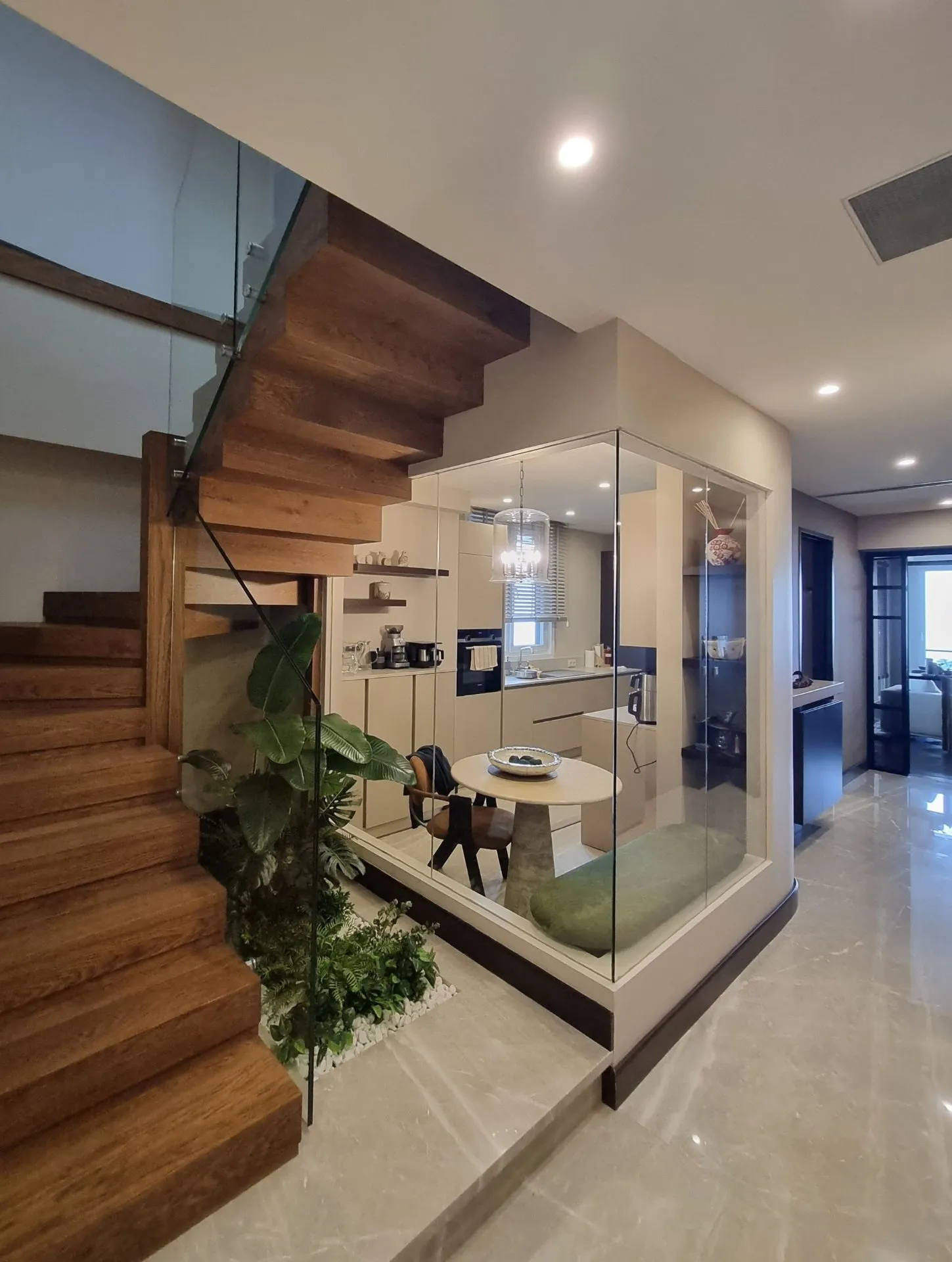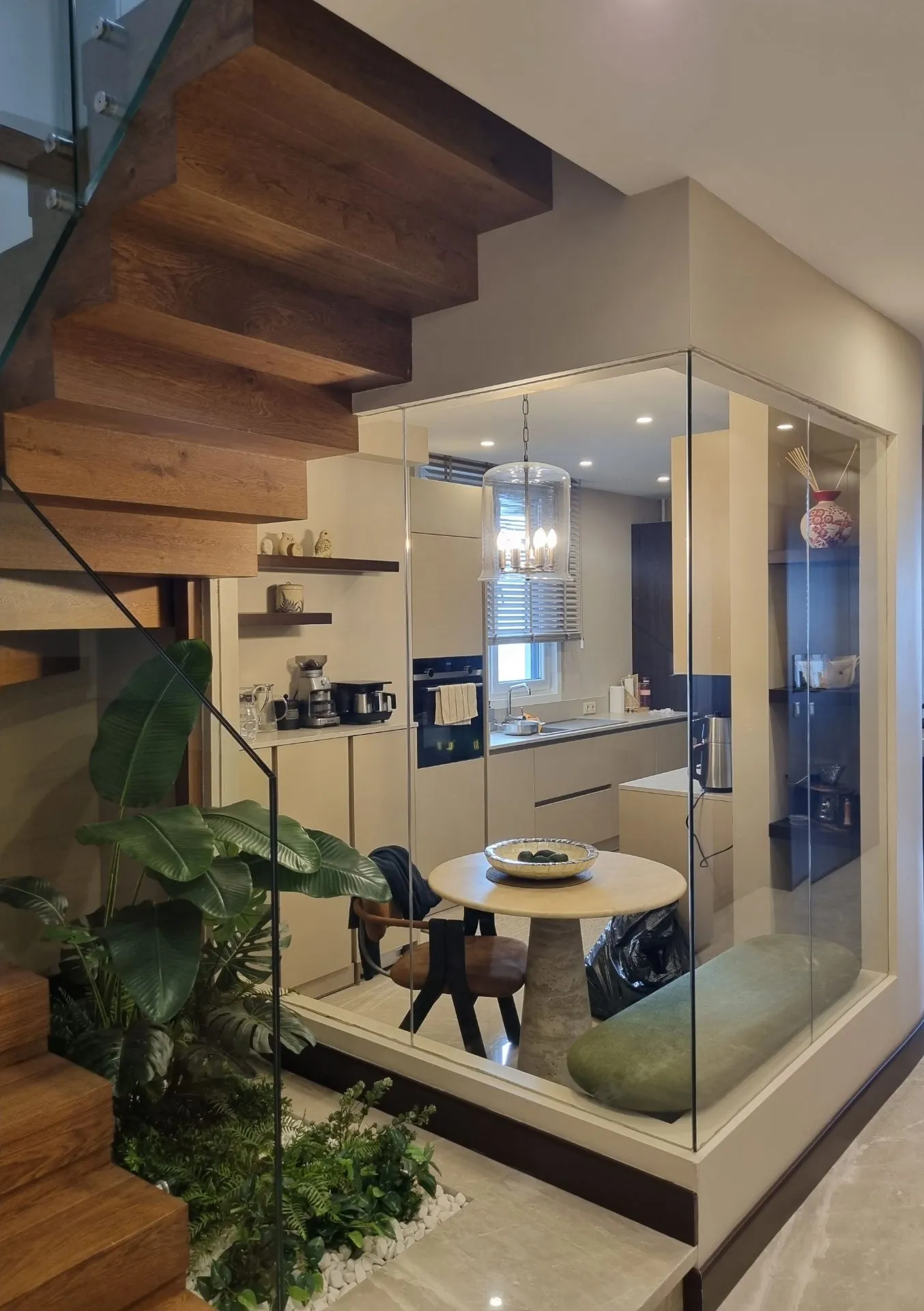 Kadıköy- Bağdat Caddesinde bulunan dubleks konutun cam bölme, cam kapılar ve cam korkulukları tarafımızdan titizlikle yapılarak teslim edilmiştir. Mutfak kısmında kullanılan cam bölücülerde profiller gizlenerek camın sıcaklığı ve şeffaflığı ön plana çıkarılmıştır. Salonda karolajlı çift kanatlı cam kapı kullanılmış, mutfakta duvar içerisine gizlenmiş sürgülü, karolajlı cam kanat kullanılarak mekana farklı bir estetik değer kazandırılmıştır. Ahşap merdivenlerde cam korkuluk kullanılarak ahşapla camın estetik uyumu sağlanmıştır.