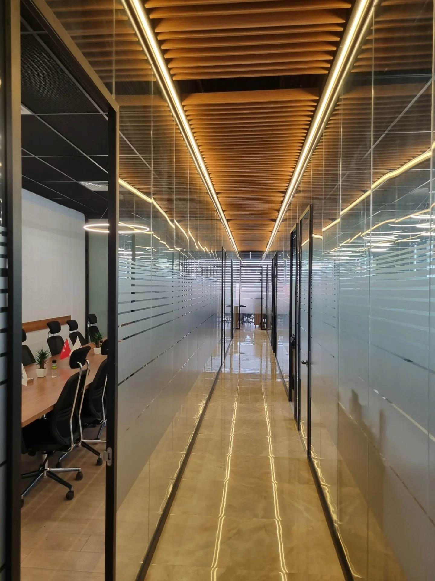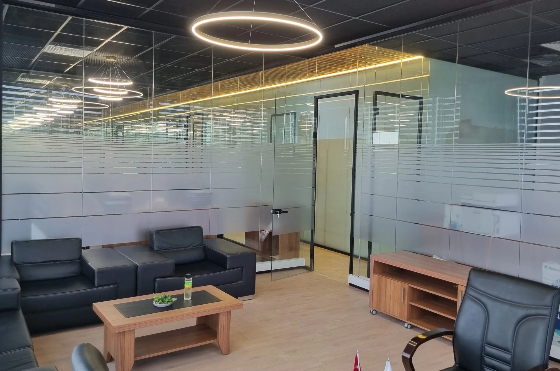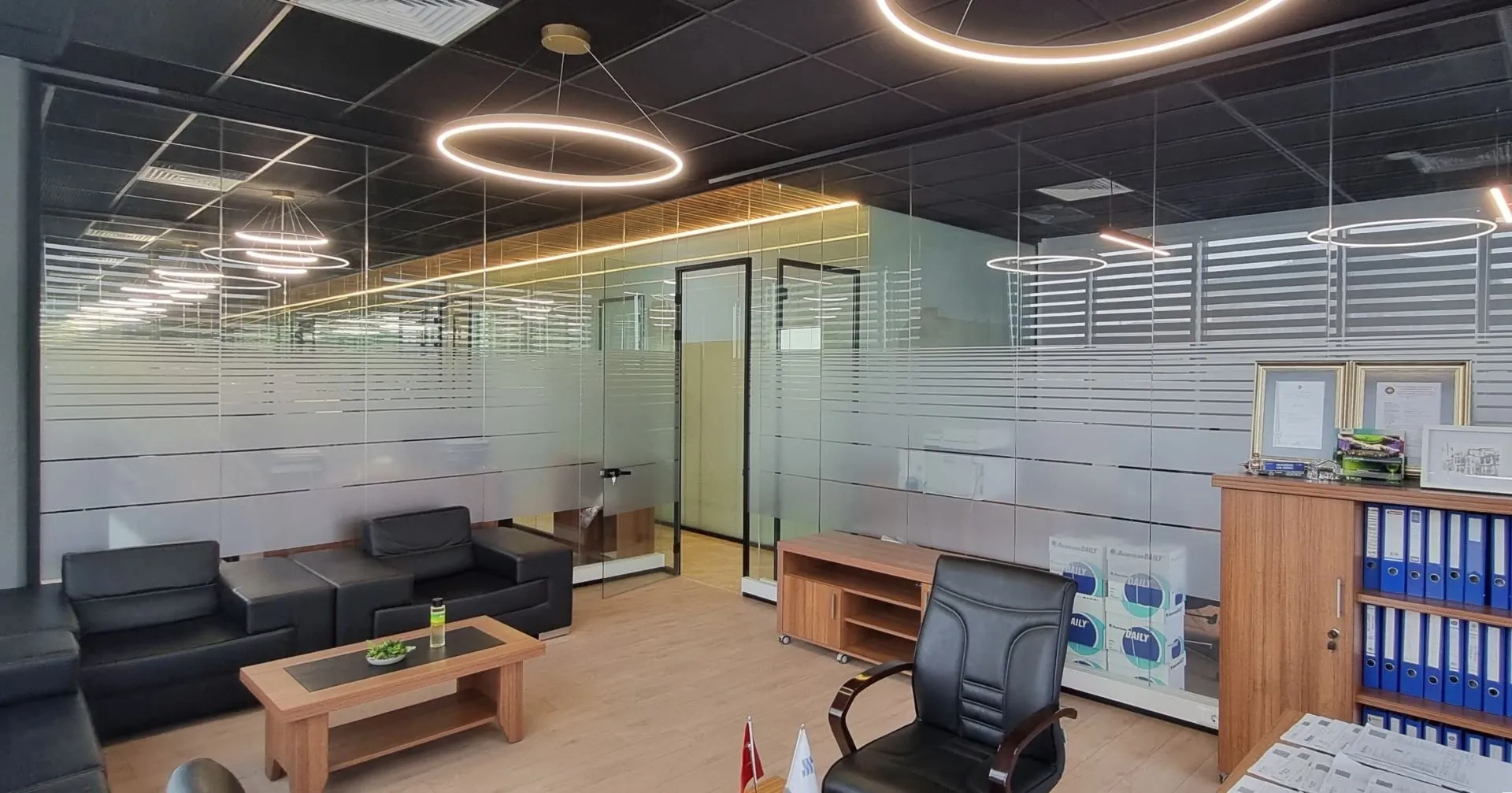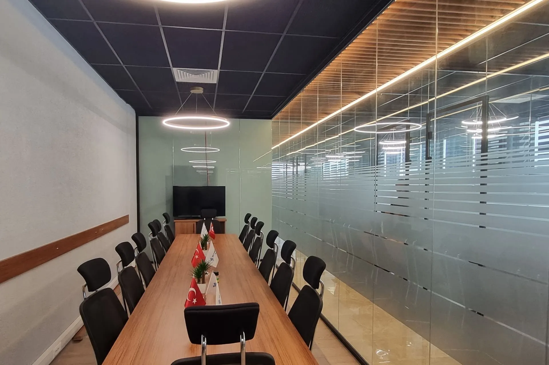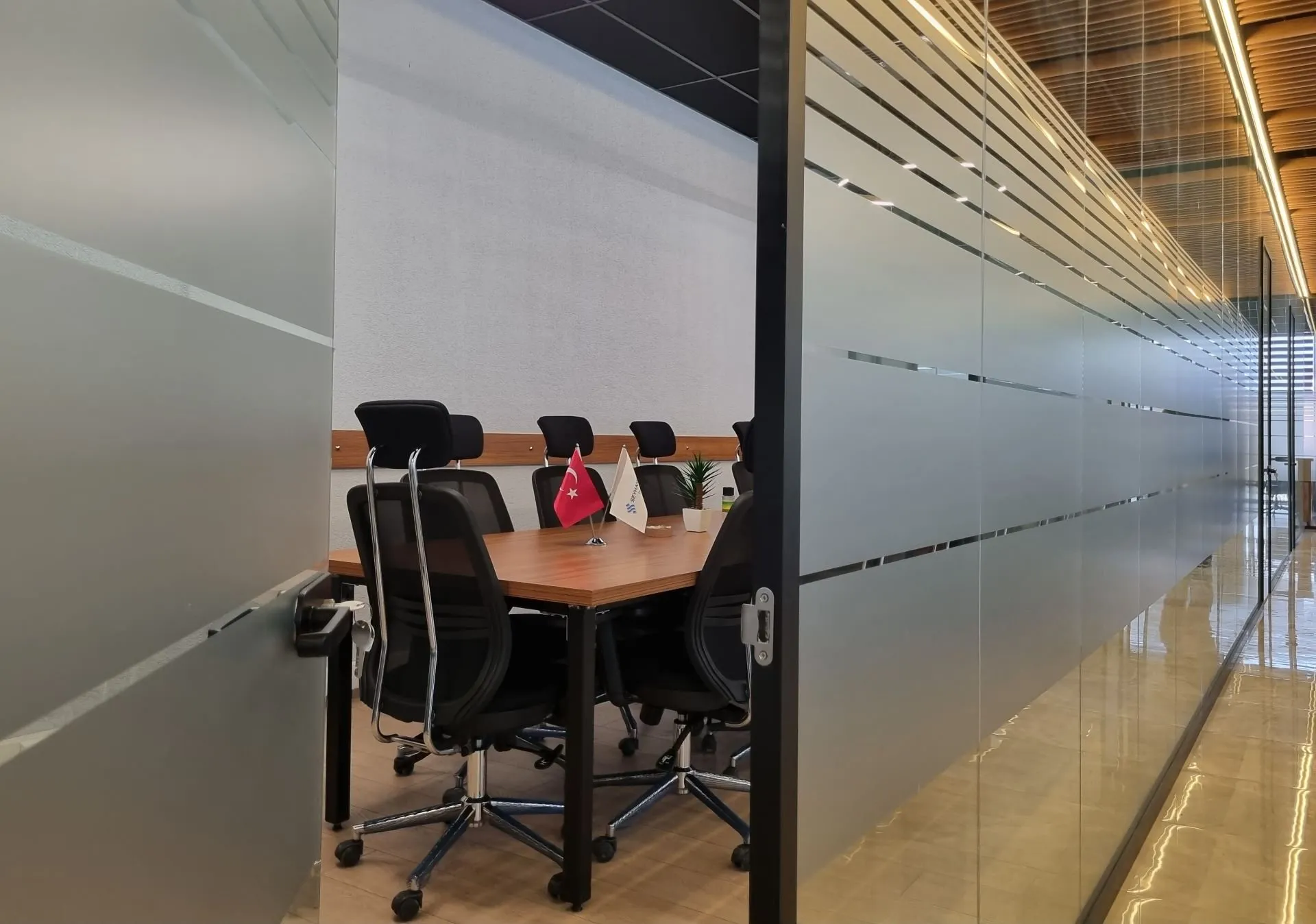 Tuzla-Orhanlı da bulunan Seyhan Cam Genel Müdürlük Binasının cam cama bölme duvar sistemleri firmamız tarafından yapılmıştır. İhtiyaca göre bazı mekanların duvarlarında opak lamine, bazı mekanlarda şeffaf cam kullanılmıştır. Duvar yükseklikleri 300 cm olduğu için kapıların yüksekliği 250 cm de bırakılmış üst kısımlarında sabit cam kullanılmıştır. Giriş ve koridorun tavanında ahşap baffle tercih edilmiştir.