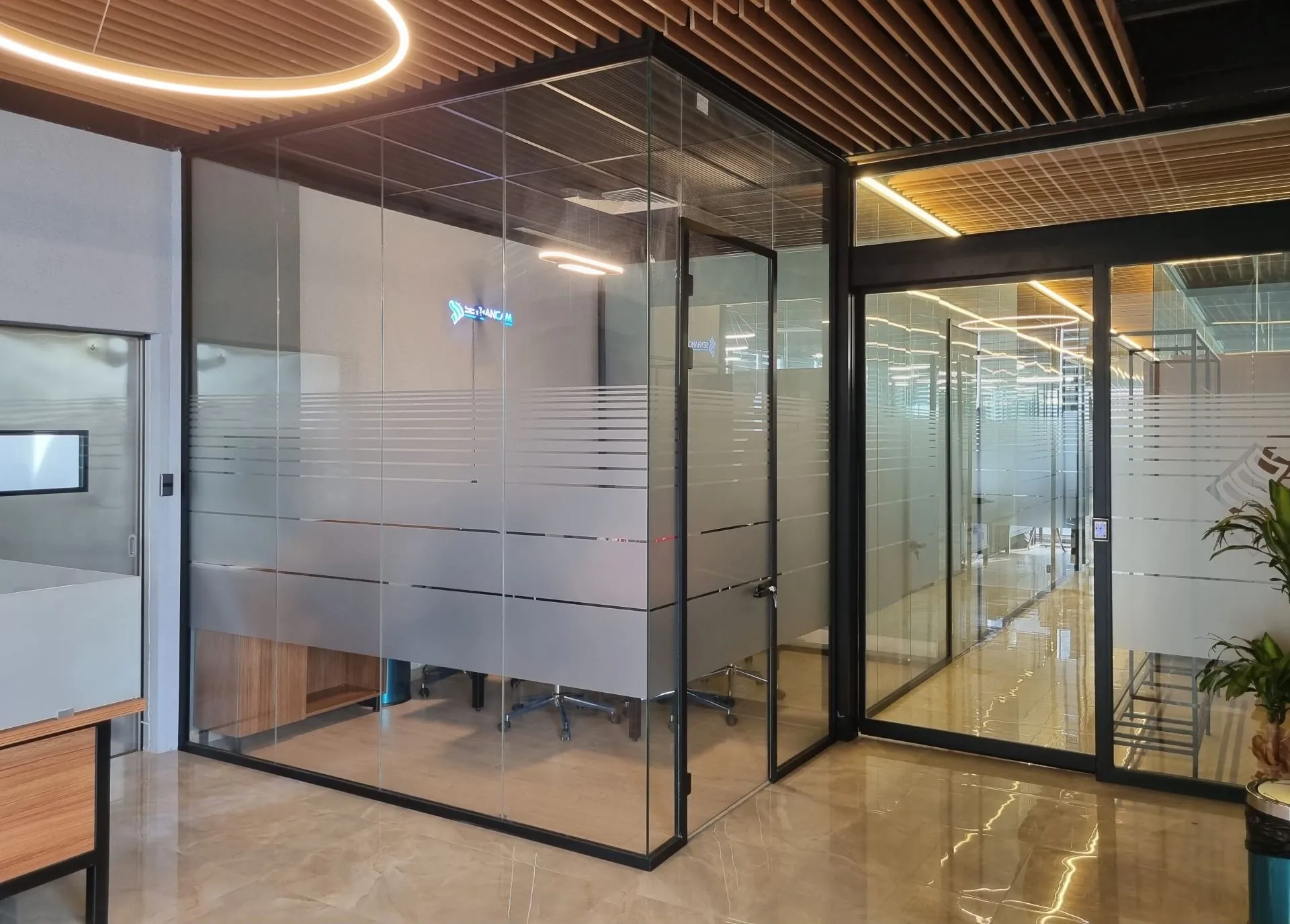 * DBS Saydam - Düşey profilsiz cam cama bölme duvar sistemi.